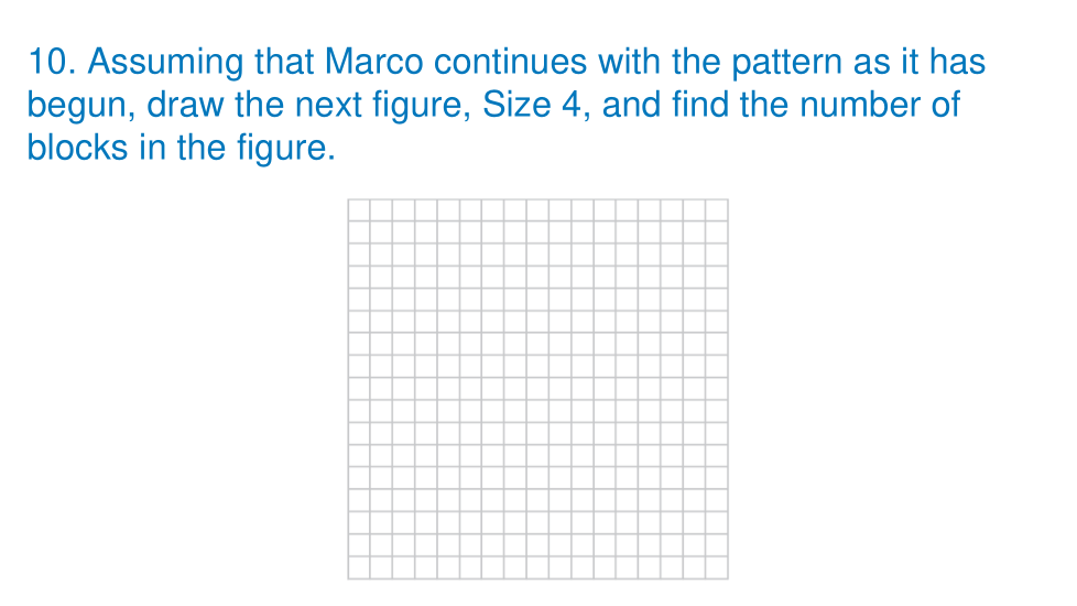 Kwa kuchukulia kuwa Marco anaendelea na muundo kama umeanza, chora mchoro unaofuata, Ukubwa wa 4, na utafute idadi ya vizuizi kwenye takwimu.