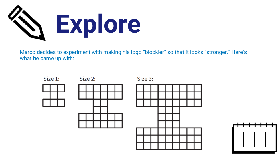 Suponiendo que Marco continúa con el patrón como comenzó, dibuje la siguiente figura, Tamaño 4, y encuentre el número de bloques en la figura.