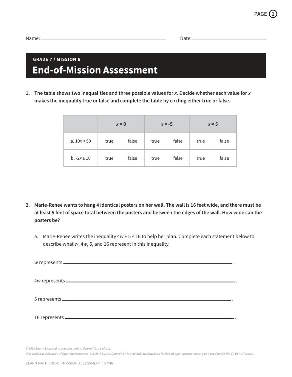 1. The table shows two inequalities and three possible values for x. Decide whether each value for x makes the inequality true or false and complete the table by circling either true or false.