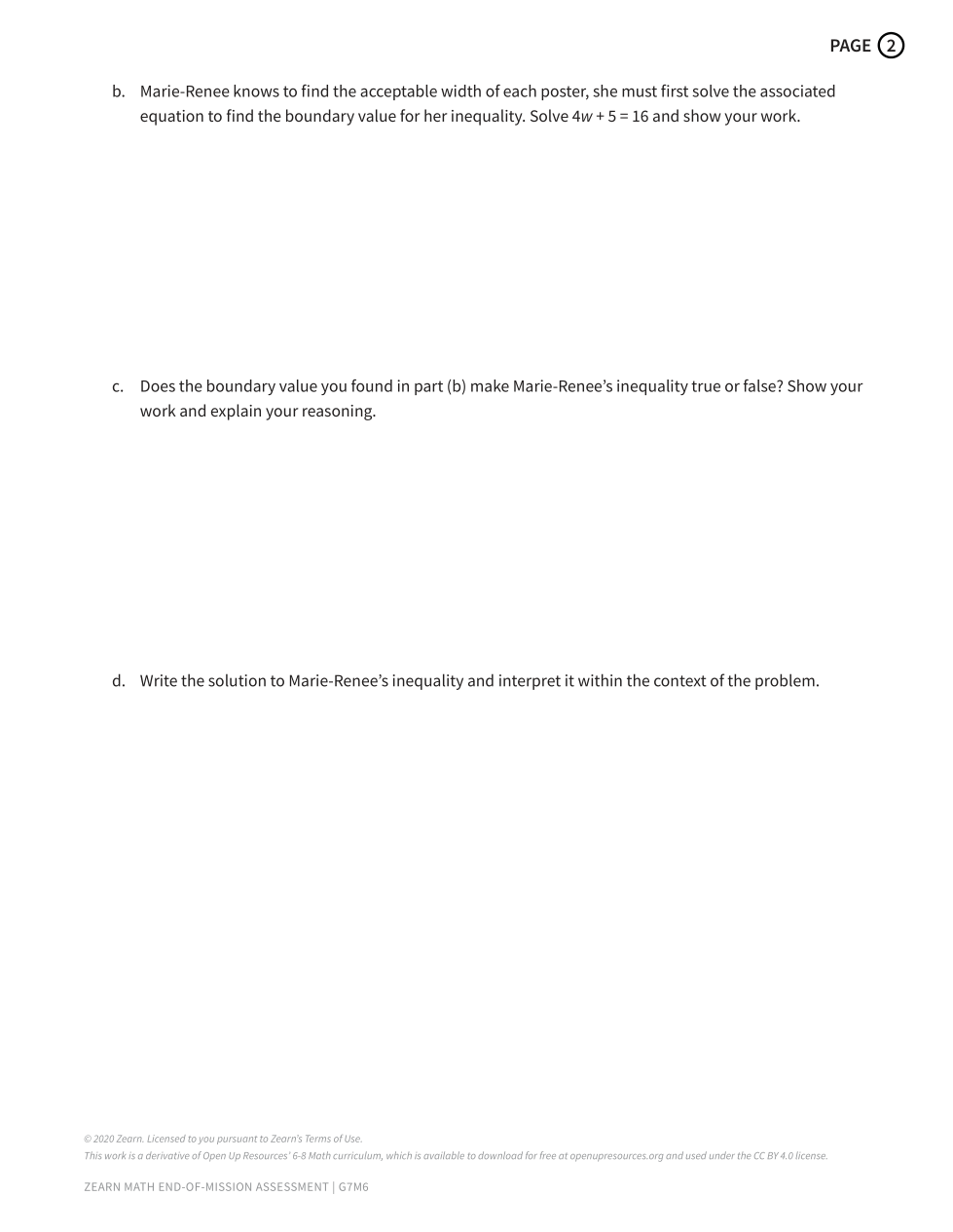2b. Marie-Renee knows to find the acceptable width of each poster, she must first solve the associated equation to find the boundary value for her inequality.