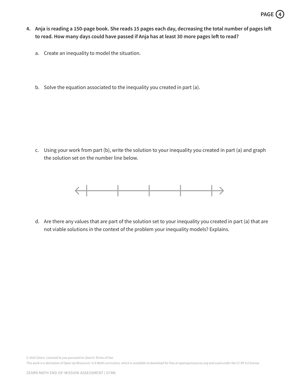 4. Anja is reading a 150-page book. She reads 15 pages each day, decreasing the total number of pages left to read. How many days could have passed if Anja has at least 30 more pages left to read?
