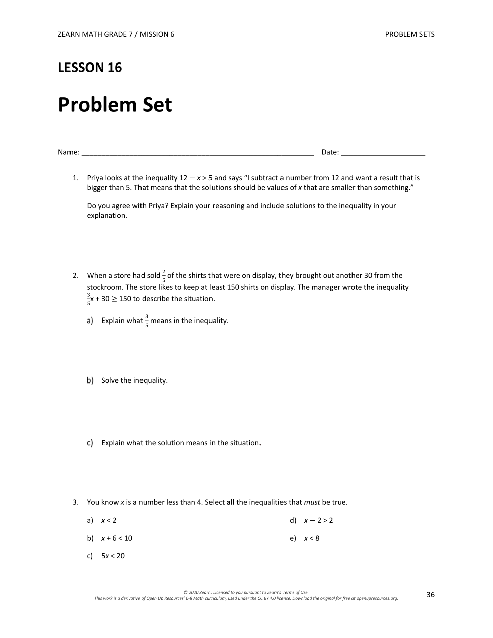 2. When a store had sold 2/5 of the shirts that were on display, they brought out another 30 from the stockroom. The store likes to keep at least 150 shirts on display. The manager wrote the inequality