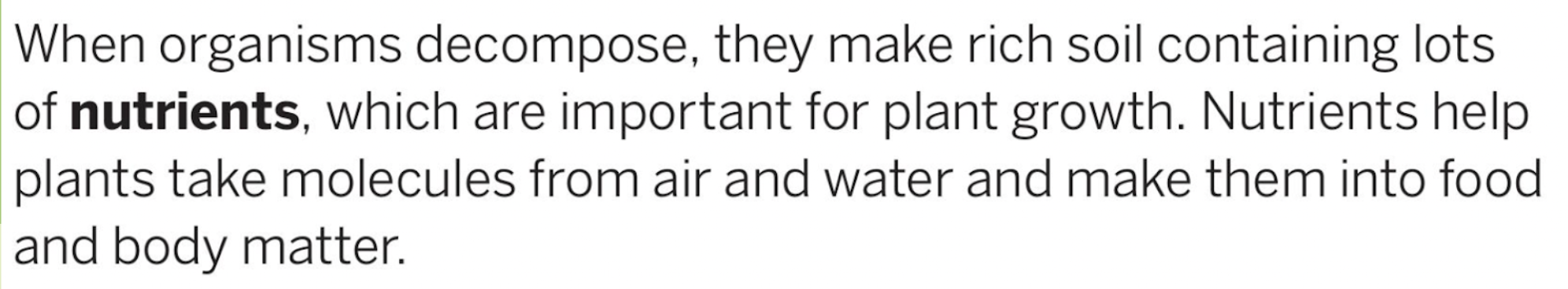 Use the words: soil, nutrients, and decomposers