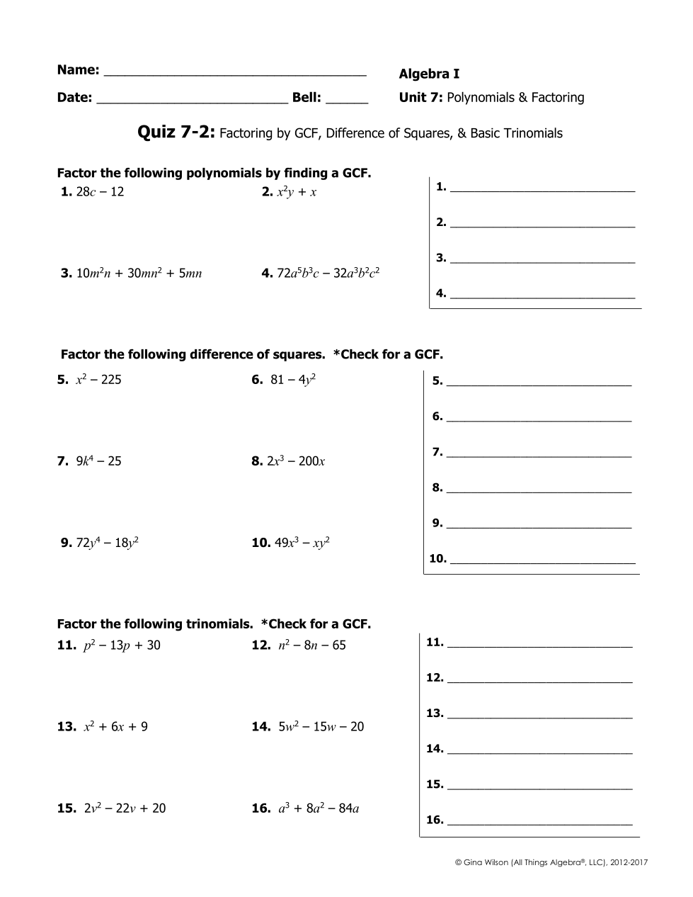Quiz 7-2: Factoring by GCF, Difference of Squares, & Basic Trinomials