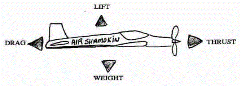 Though the diagram is that of an airplane the same basic forces also act on a rocket. There are four basic aerodynamic forces: thrust, weight, drag and lift.