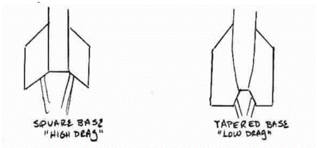 2. Base-shape. The shape of the base (bottom end) of the rocket can create drag by making a “suction area” behind the rocket that slows it down. Making the end tapered as shown below can reduce this.