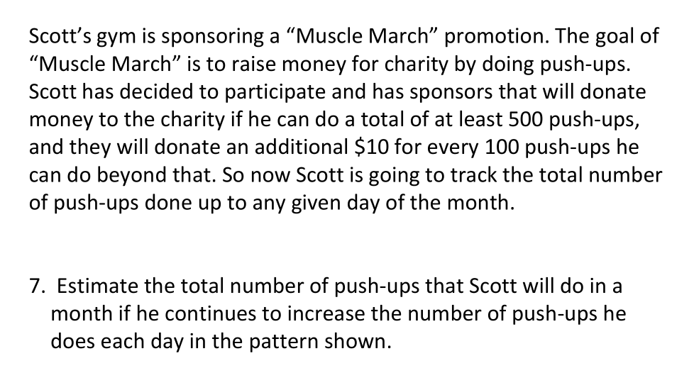 Gym ya Scott inadhamini ofa ya "Muscle March". Kusudi la "Machi ya Misuli" ni kuongeza pesa kwa hisani kwa kufanya push-ups. Scott ameamua kushiriki na ana wafadhili ambao watatoa pesa kwa hisani ikiwa ataweza kufanya jumla ya push-ups zisizopungua 500, na watatoa $10 ya ziada kwa kila push-ups 100 anazoweza kufanya zaidi ya hapo. Kwa hivyo sasa Scott atafuatilia jumla ya idadi ya misukumo iliyofanywa hadi siku yoyote ya mwezi.