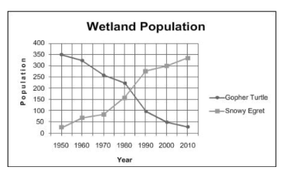 The graph below shows how the population of gopher turtles and snowy egrets changed over the last 60 years in a particular wetland. What can you infer based on the information presented in the graph?