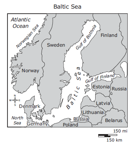 Scientists are studying the effects of climate change on th Baltic Sea. Some scientists predict that if current trends continue, the Baltic Sea will become less salty, and it will contain less dissolved oxygen. As a result of these changes, the Baltic Sea will have less biodiversity. The location of the Baltic Sea is shown on the map below.