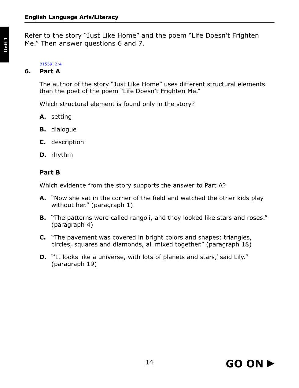 Part A: The author of the story "Just Like Home" uses different structural elements than the poet of the poem "Life Doesn't Frighten Me."