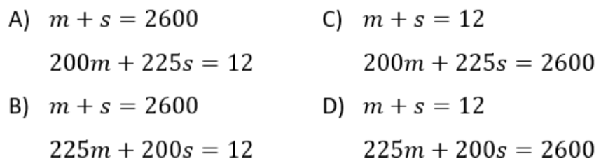 Last year you mowed grass and shoveled snow for 12 houses. You earned $225 per house for mowing lawns and $200 per house for shoveling snow for the year. You earned a total of $2600. Which system of equations could be used to find how many lawns, m, and how many sidewalks, s, you completed?
