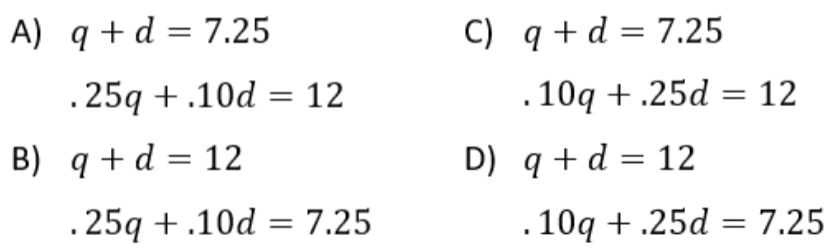 Monica has $7.25 in her pocket. The money is in quarters and dimes. There are 12 coins in total in her pocket. Which system of equations could be used to find the total number of q, quarters, and d, dimes Monica has?
