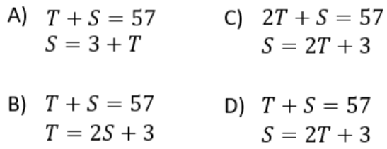 Together, Tracy and Steve have $57. Steve has $3 more than twice as much money as Tracy. Which system of equations could be used to find out how much money Steve and Tracy each have?