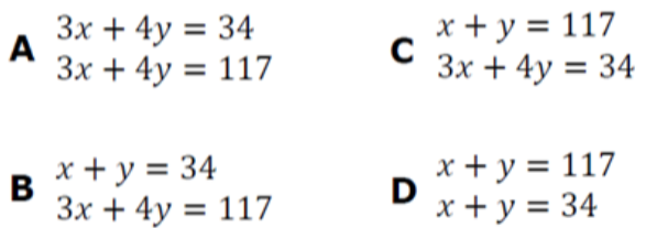 There are 34 rectangular blocks in a toy box. The height of each block is either 3 inches or 4 inches. The height of all 34 blocks combined is 117 inches. Which system of equations can be used to find the number of 3-inch blocks, x, and the number of 4-inch blocks, y, that are in the toy box?