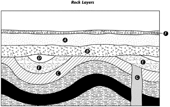 Layer F is an igneous extrusion. How could a geologist use layer F to infer the age of layer A?
