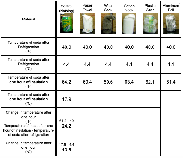 Change in temperature in oF after one hour of insulation of the soda wrapped in a cotton sock* 63.4 - 40.0