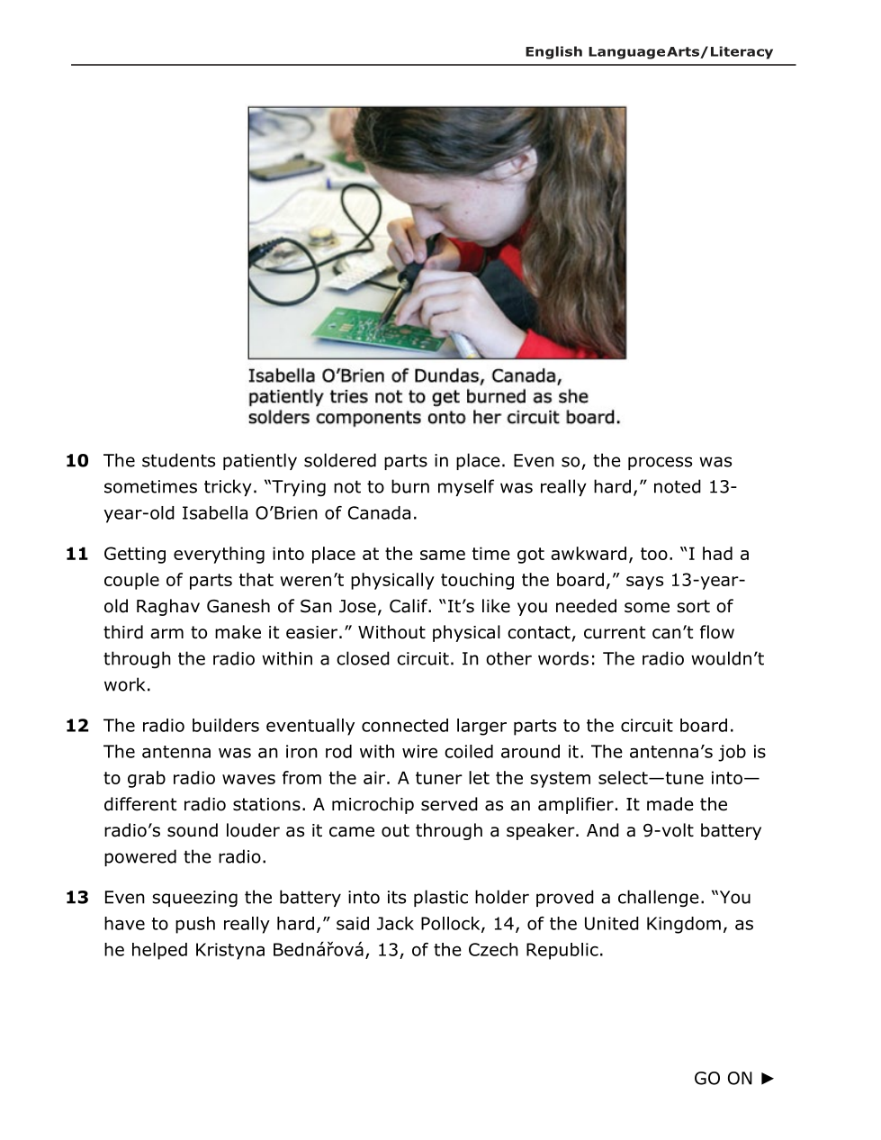 10 The students patiently soldered parts in place. Even so, the process was sometimes tricky. “Trying not to burn myself was really hard,” noted 13- year-old Isabella O’Brien of Canada.