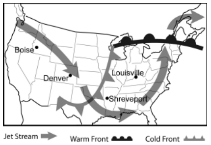 Rain and even severe thunderstorms are often associated with the passage of a cold front. Based on this information, and that provided in the weather map, which city shown is likely the one to experience severe, rainy conditions in the next day?