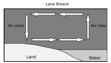 An illustration of how a convection current creates a wind, called a land breeze, is provided.