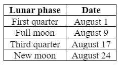 Osvaldo observes the moon several times during the month of August. He sketches the appearance of the moon on four days—August 1, August 9, August 17, and August 24—and identifies each lunar phase. Osvaldo’s data is shown in the table below.