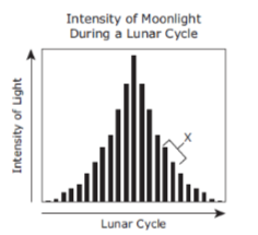The moon reflects different amounts of sunlight onto Earth at different times. This reflected sunlight is commonly called moonlight. The graph below shows the intensity of moonlight at different times in a lunar cycle.