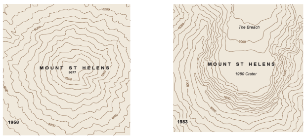 The diagrams below are topographic maps of Mount St. Helens in Washington state. They were made before and after the volcano erupted in 1980. What do these 2 maps tell us about the eruption?