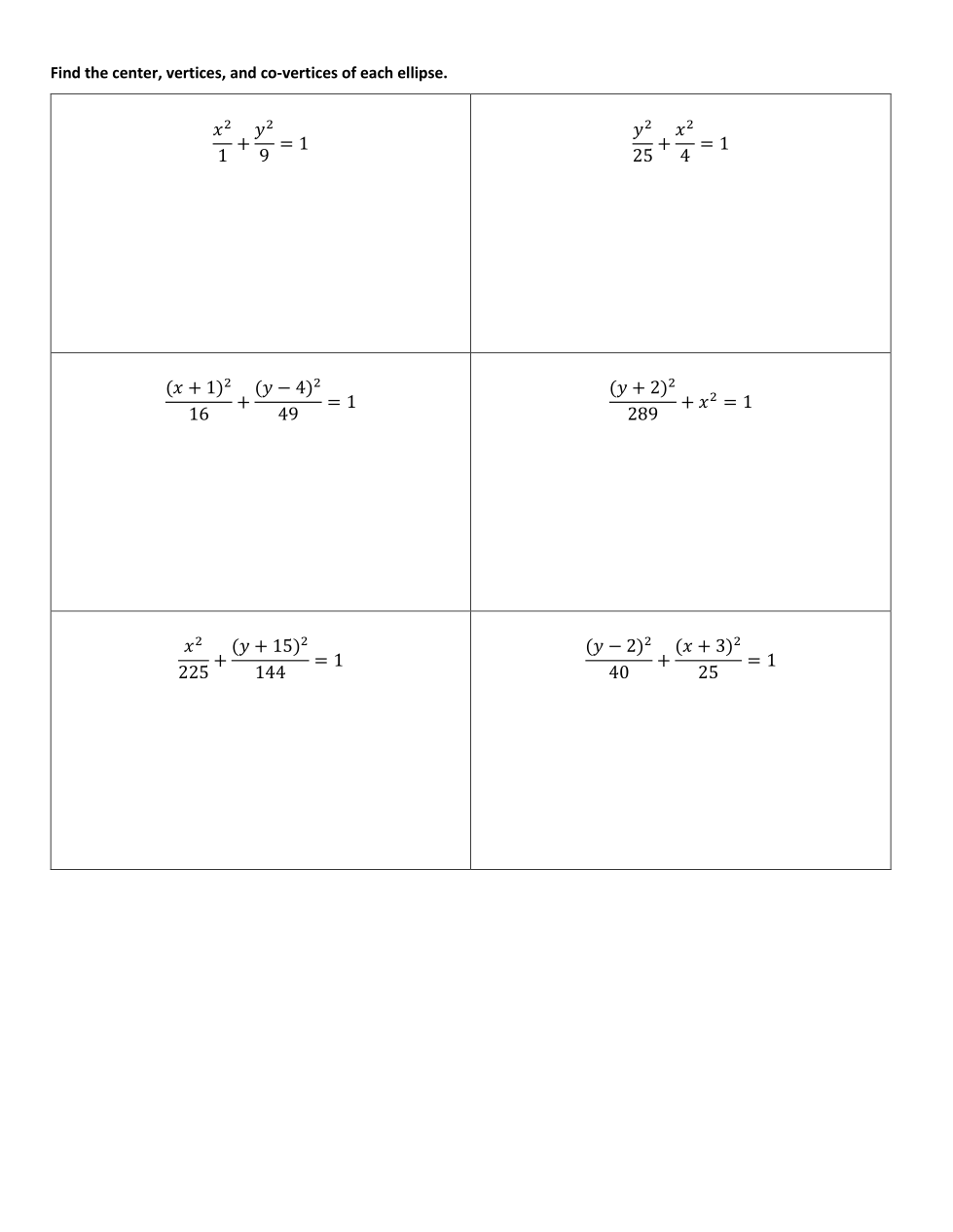 Write an equation for an ellipse that has a center at (0, 0) and passes through points (0, 4) and (2, 0).