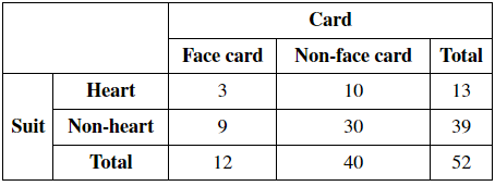 A standard deck of playing cards (with jokers removed) consists of 52 cards in four suits – clubs, diamonds, hearts, and spades. Each suit has 13 cards, with denominations ace, 2, 3, 4, 5, 6, 7, 8, 9, 10, jack, queen, and king. The jacks, queens, and kings are referred to as “face cards.” Imagine that we shuffle the deck thoroughly and deal one card.