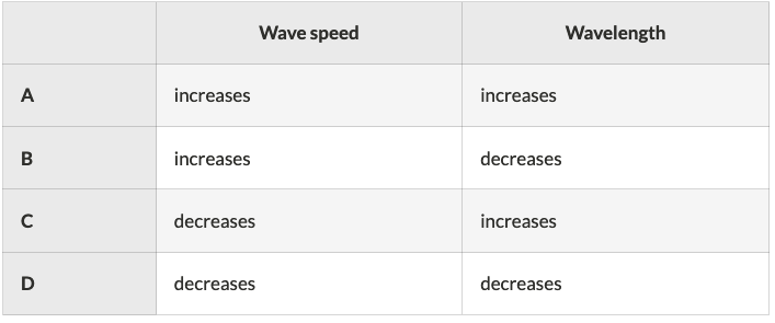 When a sound wave enters a denser medium, what happens to the wave speed and wavelength?