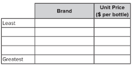 Agua--Marcia is comparing the prices of bottled water for 16-ounce bottles. The table shows the price for each brand. Complete the table to sort the brands from least to greatest price per bottle.