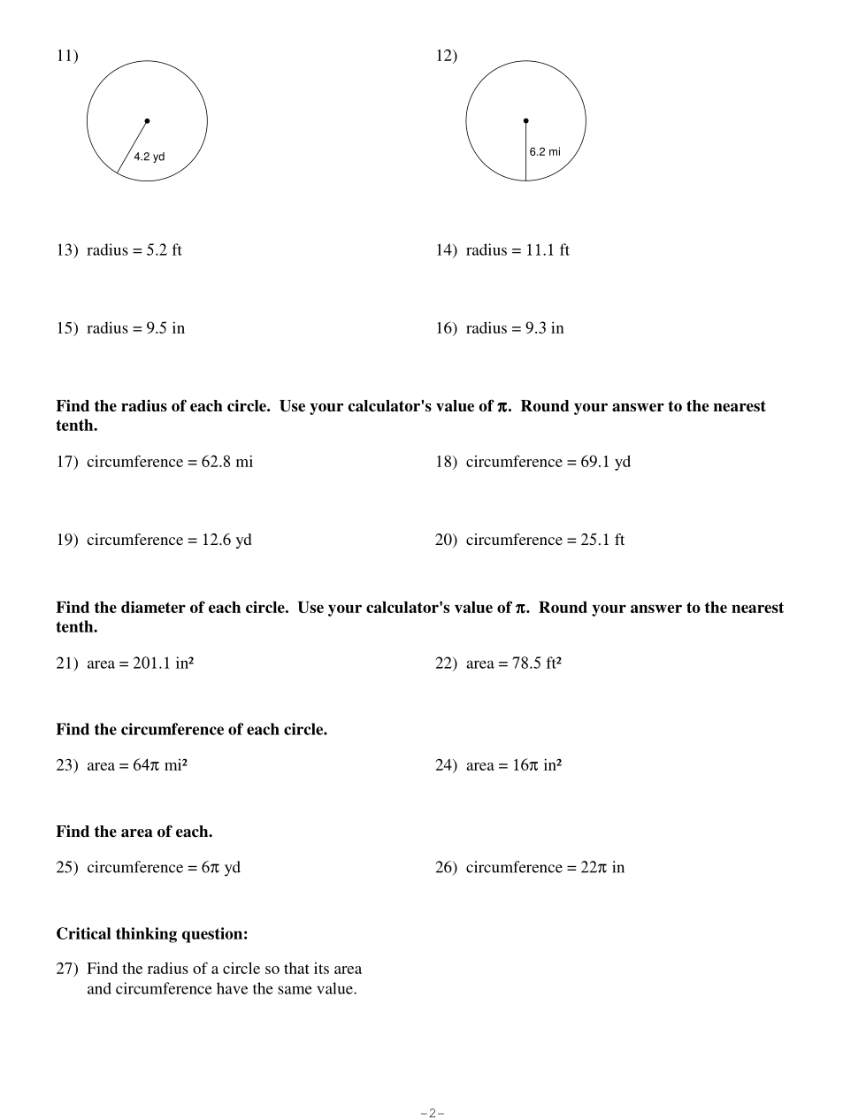 Find the radius of the circle. Use your calculator's value of pi. Round your answer to the nearest tenth.17. Circumference = 62.8 mi