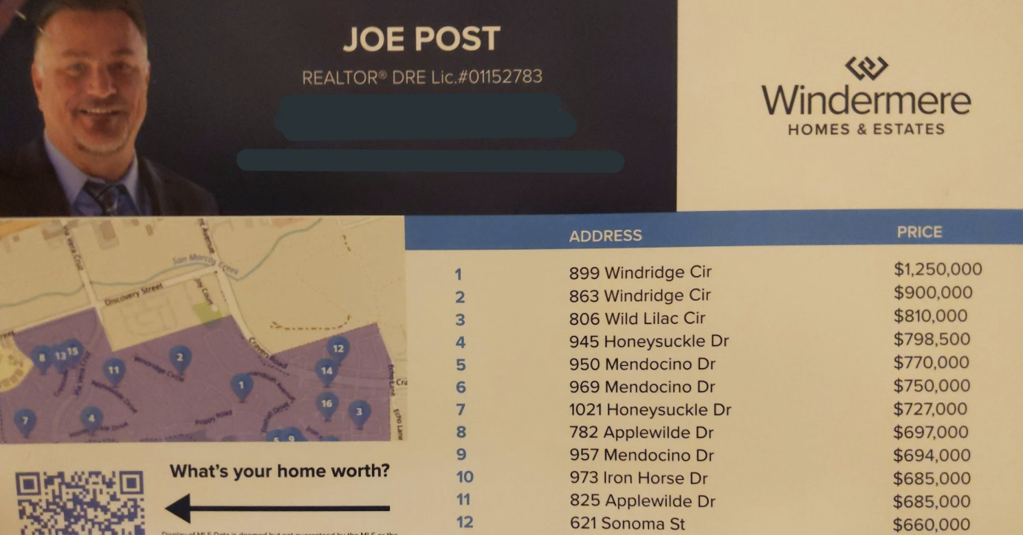 The following flyer was left on my doorstep, showing recent sales prices for houses in a San Marcos neighborhood.