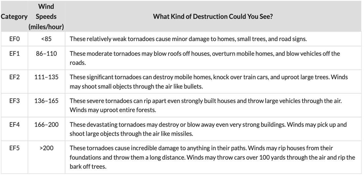 Tornadoes are categorized by their estimated wind speeds and the amount of damage they cause. The Enhanced Fujita scale breaks tornadoes into six categories. Scientists will use the amount of damage for 28 different types of construction (called damage indicators) to estimate the tornado’s wind speed and determine its EF category.