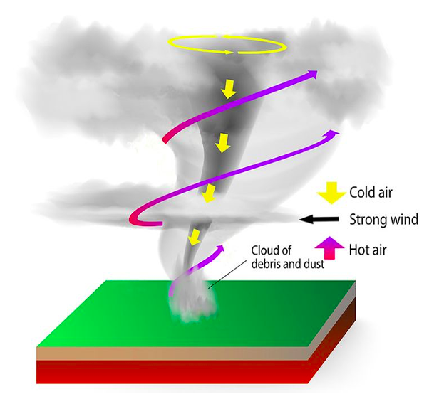 Scientists are still working to fully understand how tornadoes form. Tornadoes generally start as thunderstorms. Winds along the ground are slower due to friction along Earth’s surface. Winds in the clouds move faster due to less friction, and they also contain moist air.