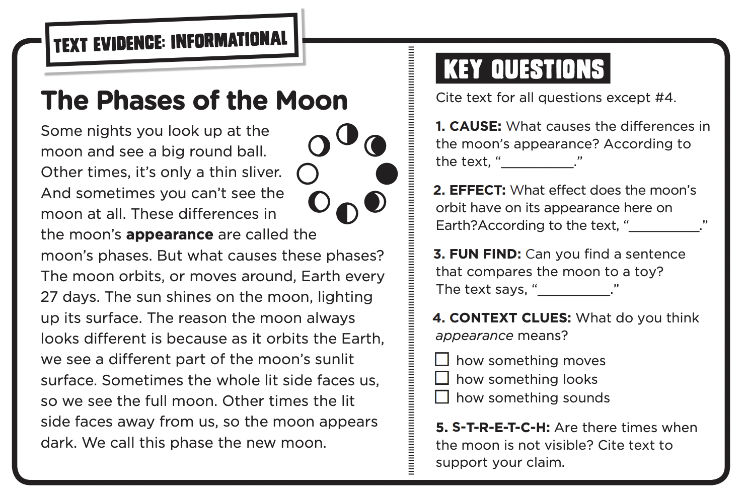 Select the correct text evidence to suppor the question. What causes the differences in the moon's appearance? According to the text, " ______________."