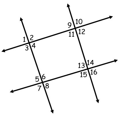 For each question, classify the pair of angles given as Corresponding Angles, Alternate Interior Angles, Alternate Exterior Angles, or Consecutive Interior Angles.