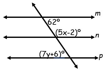 In the diagram below, m || n || p. Find the value of x and y. Write your answer as #, #