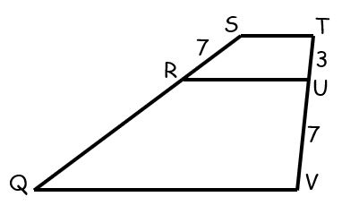 In the diagram below, given that \frac{SQ}{SR}=\frac{TV}{TU}, find RQ.
