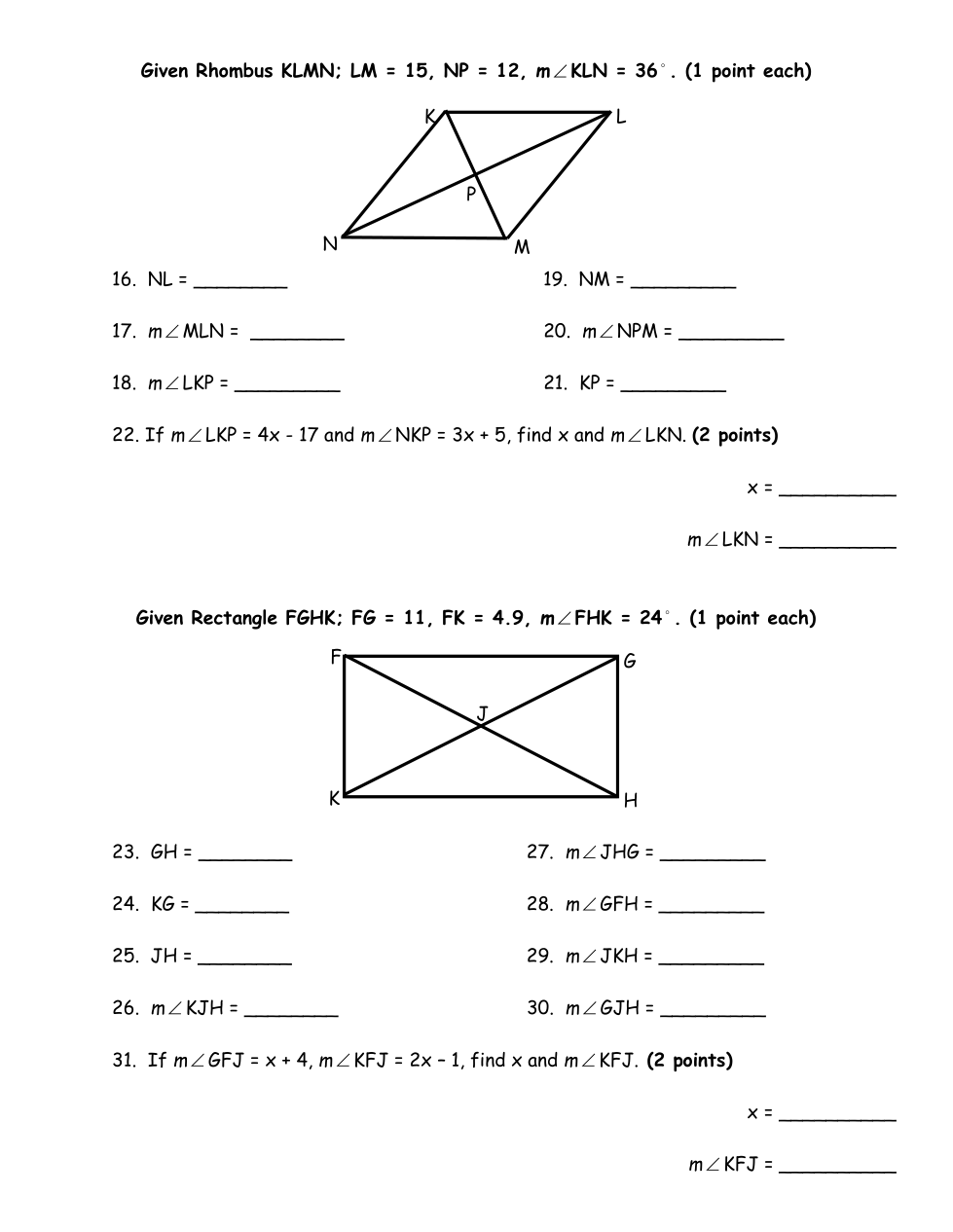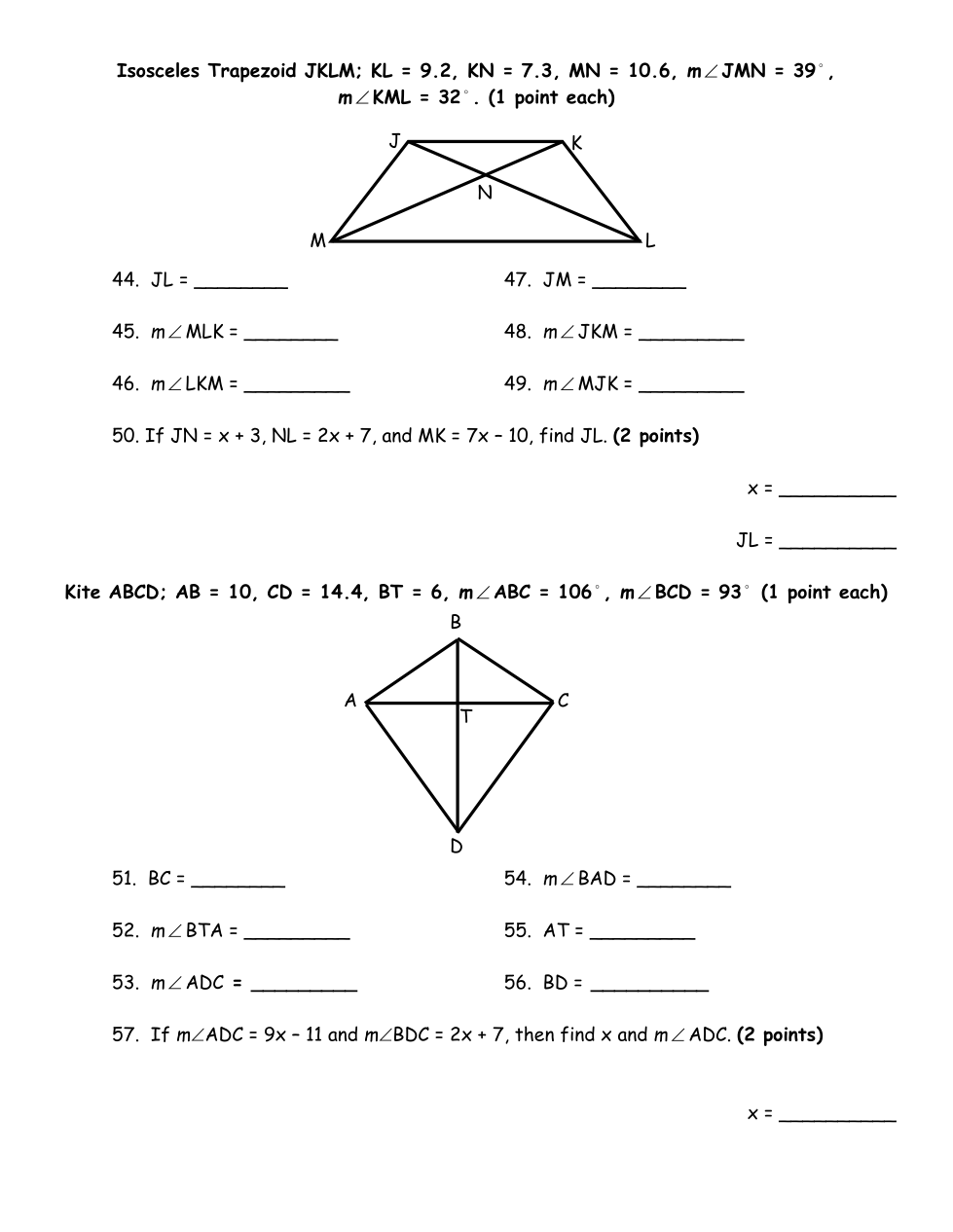 If JN = x + 3, NL = 2x + 7, and MK = 7x – 10, find x.