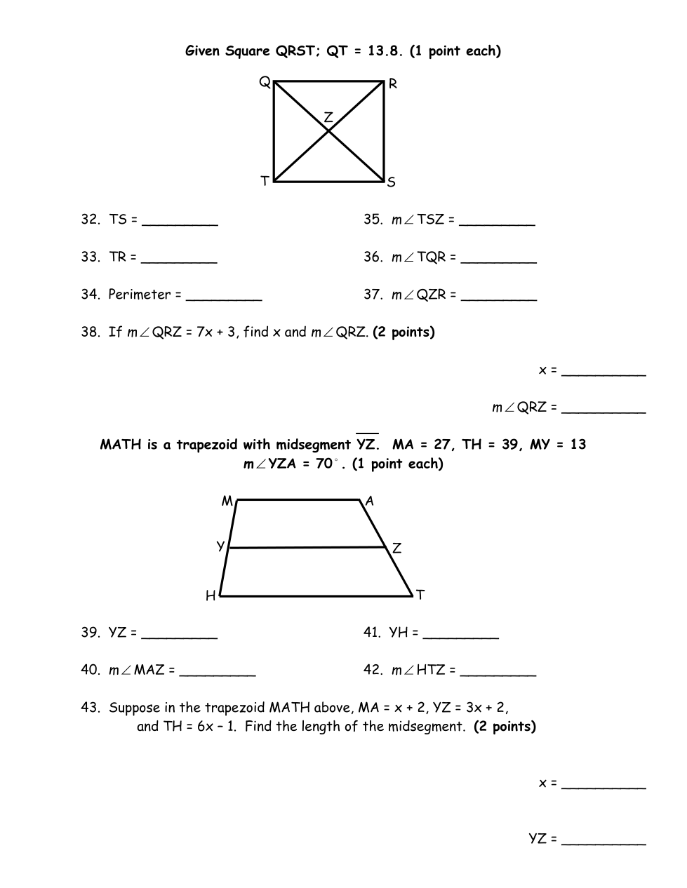 Suppose in the trapezoid MATH above, MA = x + 2, YZ = 3x + 2,and TH = 6x – 1. Find x.