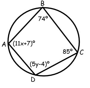 Using the diagram below, find m\angle{A} and m\angle{C}. Write your answer as A=#, C=#