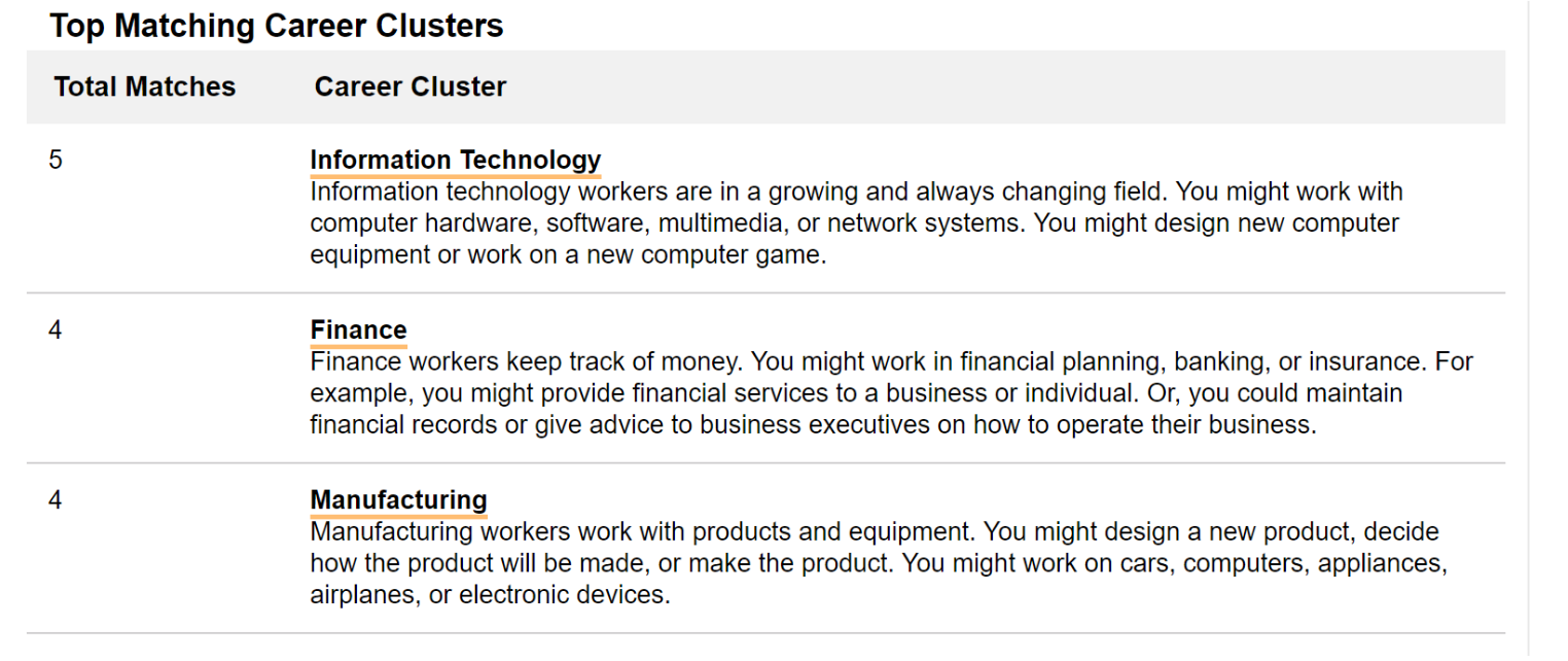 1. Career Clusters (think of this as groups or genres of jobs). The ones at the top are best matched to you.