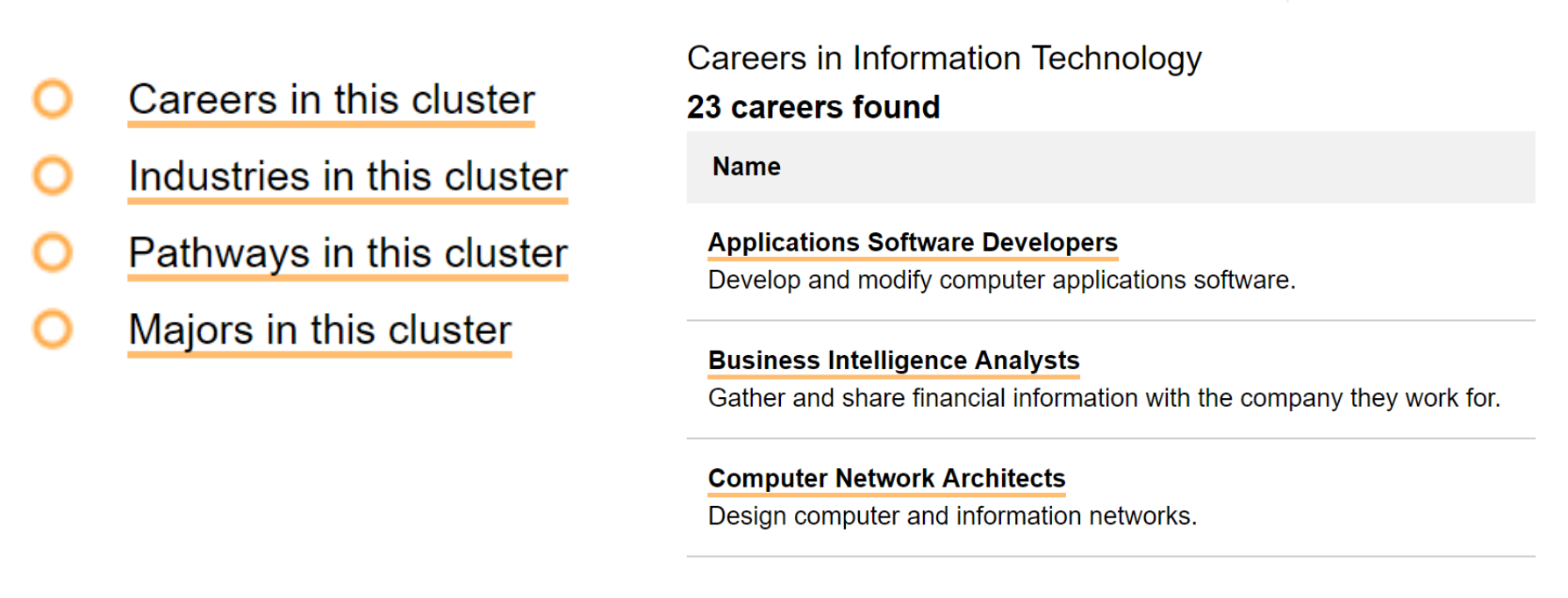 2. After 10 or so pages of the survey, you should get some career clusters. Click on these and click “Careers in this cluster” to find individual jobs that might interest you.