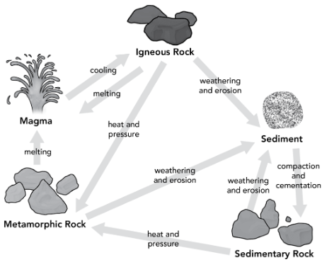 Salia is creating a diagram to show how rocks go through the steps of the rock cycle. Her diagram shows the processes that occur to change rocks from one type into another type.