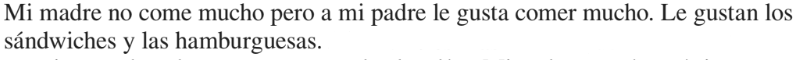 Mi madre no come mucho pero a mi padre, le gusta comer mucho. Le gustan los sándwiches y las hamburguesas.
