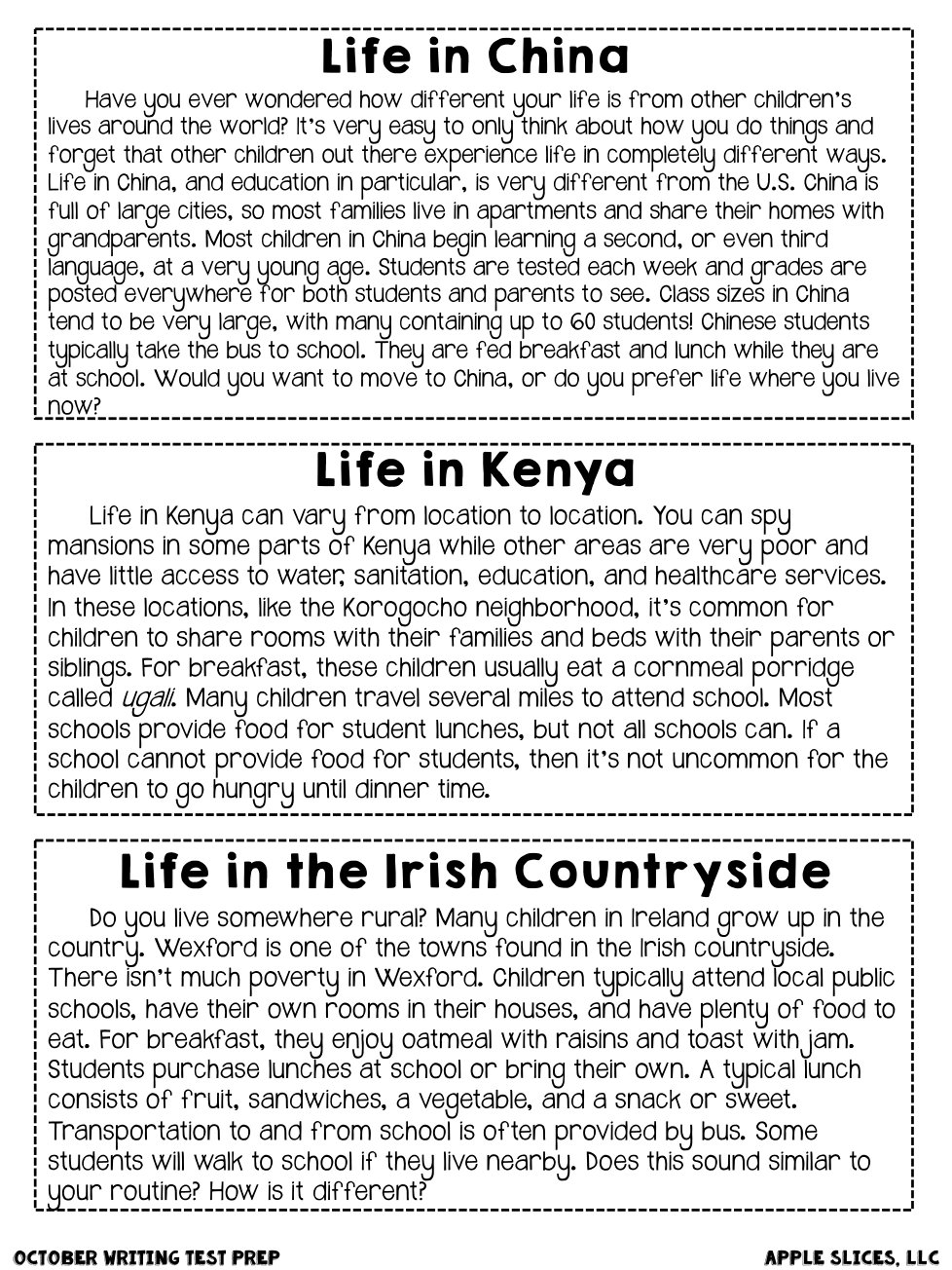 Refer to the passages “Life in China,” “Life in Kenya,” and “Life in the Irish Countryside.” Write an essay that compares and contrasts life in China, Kenya, and Ireland. Be sure to use examples from the passages.