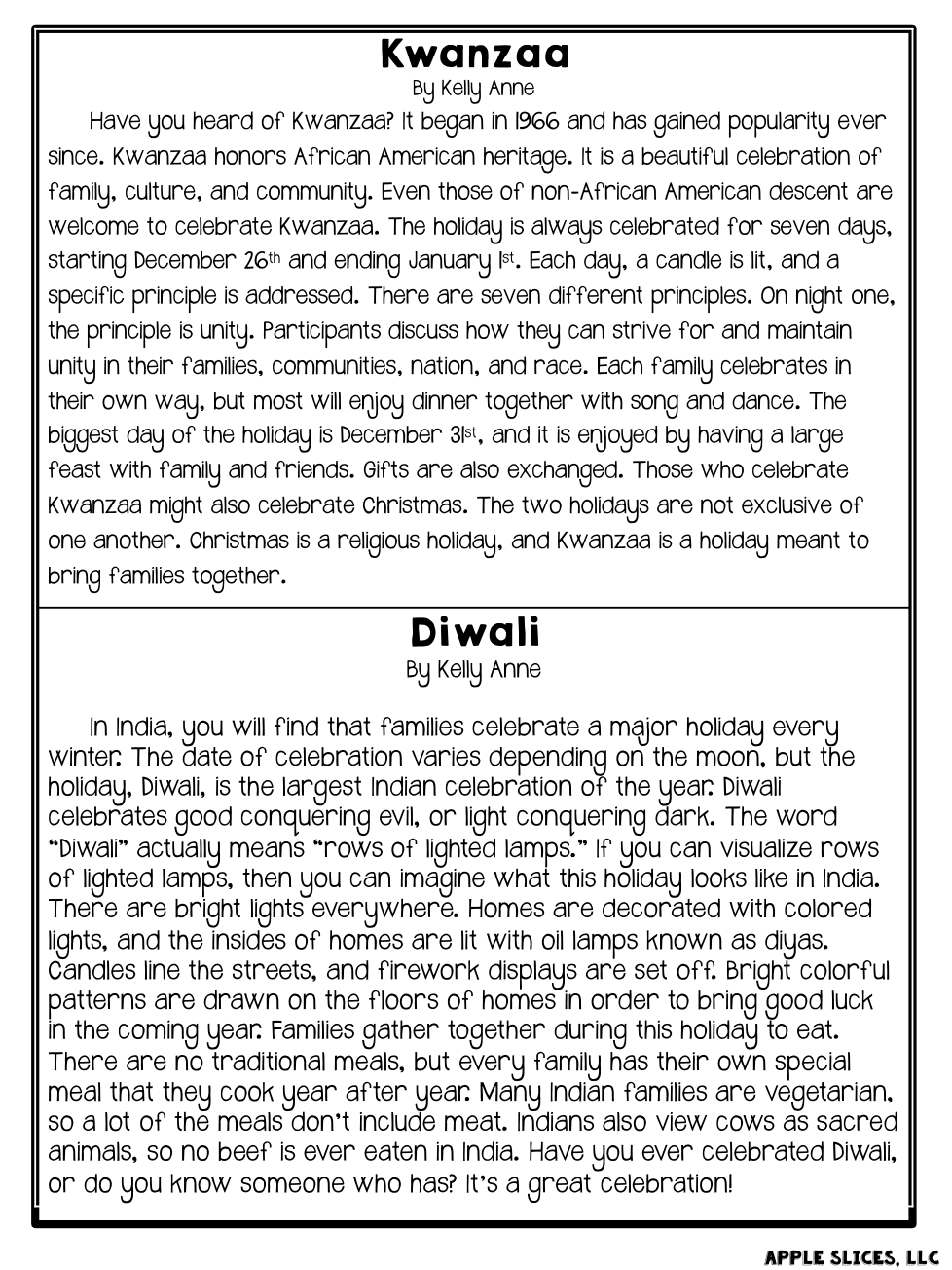 Refer to the passages: “Kwanzaa” and “Diwali.” How do these two holidays differ? Write an essay that compares and contrasts the two. Be sure to use information from the passages.