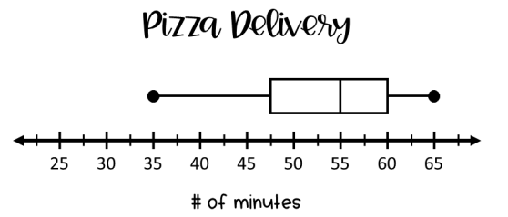 The data below shows the number of minutes a group of customers had to wait for their pizza to be delivered on a busy Friday night. Select a conclusion that can be drawn from the box plot.