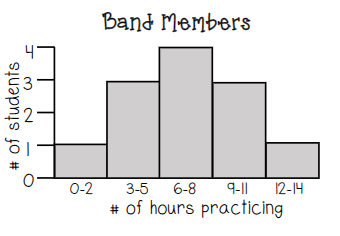 The histogram below represents the number of hours spent practicing by the band members at a local high school. Select 2 conclusions that can be drawn from the histogram.