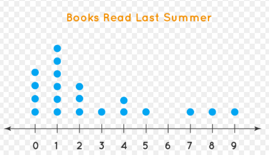 The dot plot below represents the number of books read in Mrs. Davis' class last summer. Use the data to answer the questions.
